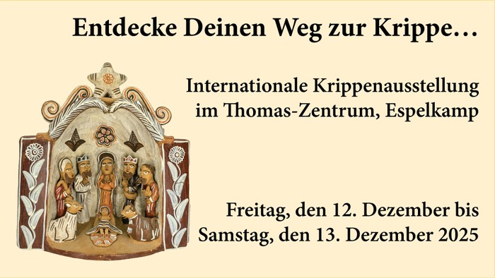 Diese Krippen, die Pfarrer Christian Hohmann und Pfarrerin Joy dela Cruz, im Thomashaus ausstellen werden, möchten uns hineinnehmen in die Weihnachtsgeschichte. In den Gesichtern der Krippenfiguren spiegeln sich Hoffnung, Freude, Staunen, aber auch die Suche, zu verstehen, was sich damals in Bethlehem ereignet hat. Krippendarstellungen können uns helfen, Weihnachten neu zu entdecken und zu verstehen. Dazu möchte die Ausstellung einladen zum Betrachten und Staunen, damit es am Ende ein persönlicher Weg wird, der uns zur Krippe führt.