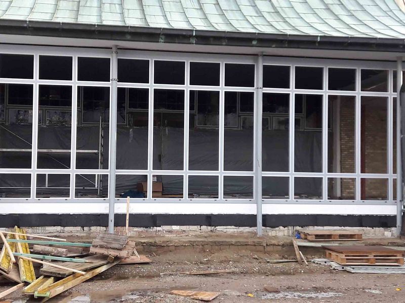 Stand 27. Nov. 2017: Montage aller Fensterelemente für das Foyer. Eine Bedingung des Denkmalschutzes war die möglichst genaue Wiederherstellung der Fensterfront im Foyer.Nachdem es eine Zeitlang so aus sah, als wenn die ganze Baustelle ruht, hat sich doch immer etwas getan. Die Elektrofirma (Badzio/Espelkamp) hat die Schlitze für die Kabel die Wände geschnitten und die Unterputzdosen gesetzt. Die Dachdeckerfirma (Menninghaus/Lübbecke) hat die Dächer abgedichtet und die Fußböden in den Räumen abgeklebt. Witterungsbedingt konnte die Wärmedämmung für die Dächer noch nicht aufgebracht werden.