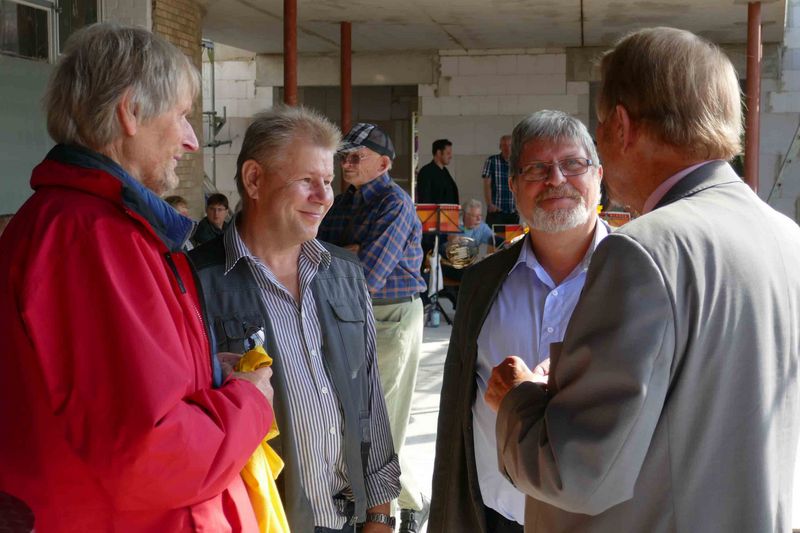 Was für ein Tag! Das Wetter zeigte sich von seiner besten Seite. Das Vorbereitungsteam (Arnhold Steffan, Kurt Henning, Katja Gläser, Carola Zschocke) hatten ganze Arbeit geleistet. Pünktlich um 15.00 Uhr eröffnete Pfarrer Falk Becker das Fest und nach einer kurzen Begrüßung und einem Zwischenspiel des Bläserkreises unter Leitung von Kantor Tobias Krügel, richteten folgende Gäste ein kurzes Grußwort an die zahlreich erschienen Gemeindeglieder: Architekt Schmersahl, Bauleiter Schwiertz, Pfarrerin Kortenbruck (überreicht einen Scheck der Kirchenkreisstiftung), Frau Vorwerg als Vertreterin der Stadt, Sponsor Paul Gauselmann, Pfr. Falk Becker als Vorsitzender der Presbyteriums.