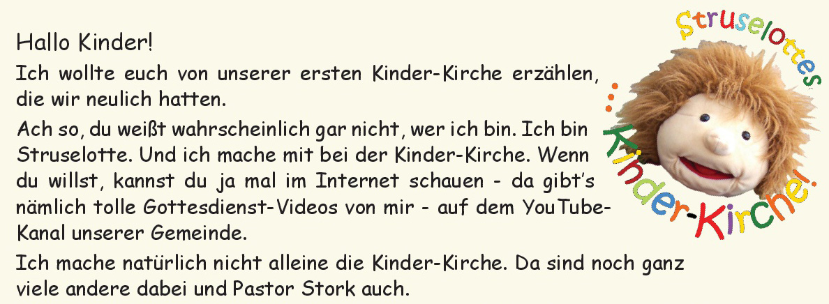 Einmal im Monat treffen wir uns in der großen Kirche und hören spannende Geschichten von Gott und Jesus. Und wir basteln und malen tolle Sachen und haben jede Menge Spaß. Mit dabei sind Pastor Stork und sein Team und natürlich ich – eure Struselotte. Also, wenn ihr mal reinschauen wollt, würde ich mich super freuen. Eure Eltern können die Termine für unsere Kinder-Kirche auf der Homepage sehen.